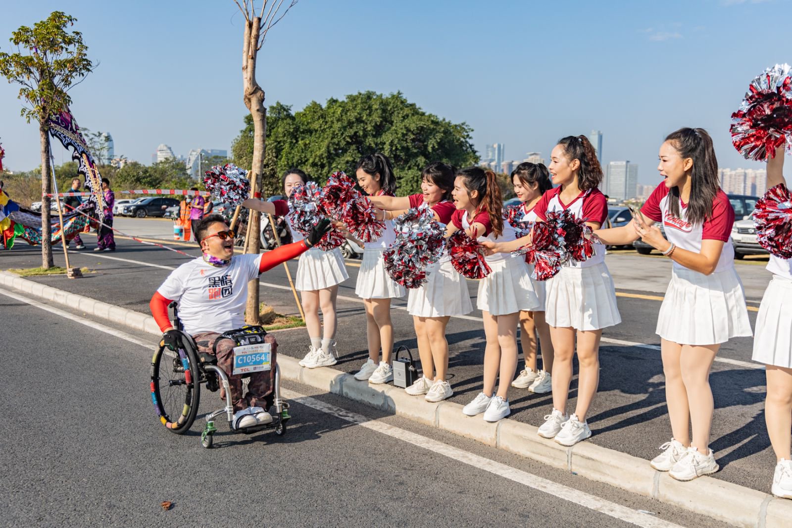 終點(diǎn)前的“榮耀通道”成為賽事又一高潮:麒麟舞振奮人心,惠州學(xué)院近60名漢服啦啦隊(duì)衣袂翩躚,傳統(tǒng)與時(shí)尚交織,80名終點(diǎn)氛圍志愿者齊聲喝彩,共同構(gòu)筑了一條聲浪與熱情交織的沖刺長廊。