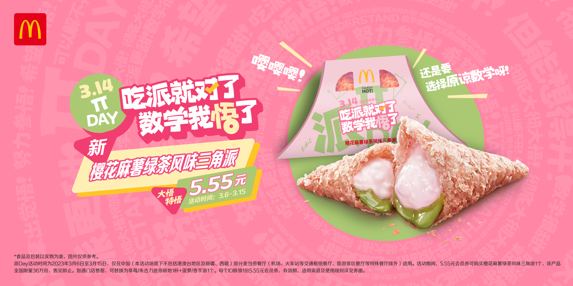 因“派” 與 “π” 諧音,麥當勞每年在3月14日國際圓周率日前后舉辦一系列 “派DAY” 慶祝活動。“派Day吃派就對” 也已經(jīng)成為眾多粉絲一年一度的期待和默契。值得一提的是,今年活動期間,麥當勞會員還可通過指定微信小程序頁面,一起在線跟讀“數(shù)學大悟口訣”,并且領(lǐng)取櫻花麻薯綠茶風味三角派優(yōu)惠券。這款會員專屬三角派,由粉色酥皮包裹櫻花風味卡仕達醬和綠茶風味卡仕達醬,搭配麻薯餡料,口感清新香甜、外酥里糯。在滿滿的春日氣息之間,體會數(shù)學的浪漫和魅力。