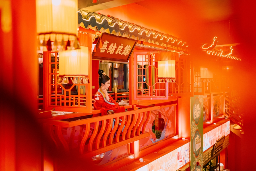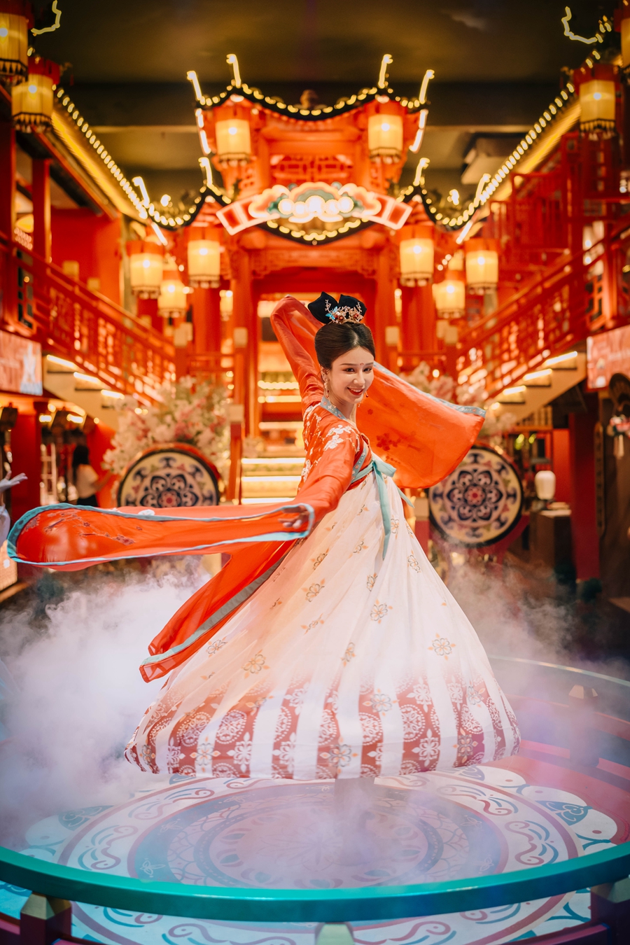 游客置身城中,切身感受到唐朝的風(fēng)土人情:從身邊走過(guò)的盛唐“名人”、整齊排列的大唐市集、隨著古風(fēng)音樂(lè)翩然起舞的驚鴻麗影……游客還可以在市集內(nèi)購(gòu)買(mǎi)唐風(fēng)物件的仿古“大唐寶鈔”,可選擇參加“變裝秀”,仿佛開(kāi)啟了一趟穿越之旅,恍惚與李白對(duì)酒當(dāng)歌,與貴妃同醉,與唐朝人搭話(huà)閑聊,不時(shí)有挑著扁擔(dān)的唐朝小販吆喝著從身邊走過(guò)。精心打造的場(chǎng)景讓游客身處大型情景劇,每一位游客都是穿梭其中的主角,擁有著更加豐富、深刻的用餐感受,同時(shí)也體驗(yàn)到唐朝文化的魅力和旅游的樂(lè)趣。