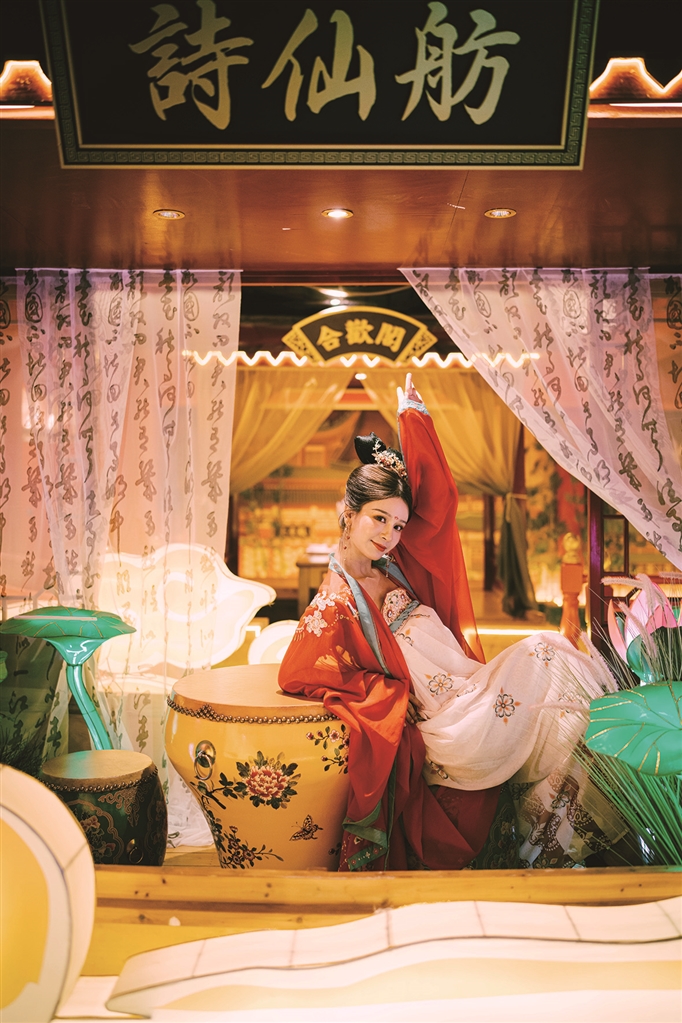 身著唐朝服飾穿梭于店內(nèi)的士兵、侍女,挑著扁擔(dān)的小販,華麗的唐朝歌舞……一場“唐宮夜宴”生動浮現(xiàn)。因?yàn)閳鼍暗难由欤鞣N飲食滋味也有了百般變化,讓游客擁有更加豐富、深刻的用餐感受。
