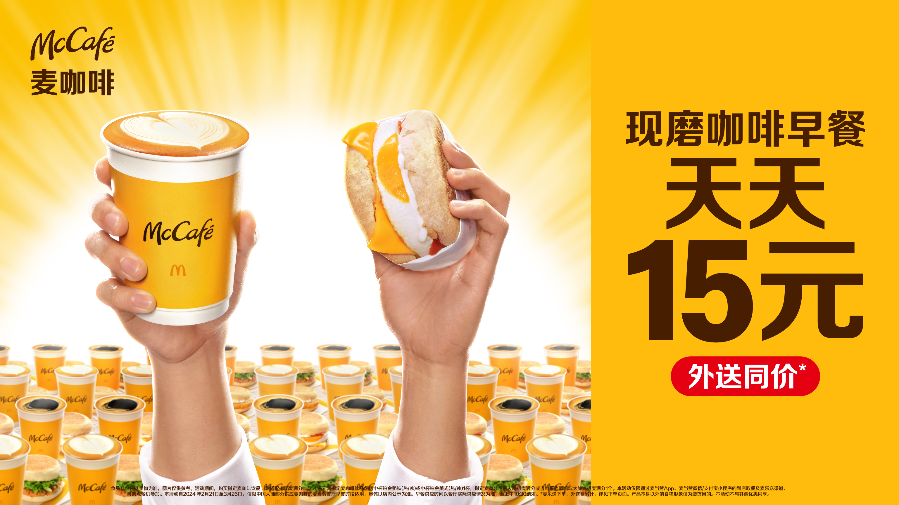2024年2月21日,麥當勞中國宣布推出全新15元現(xiàn)磨咖啡早餐組合,以麥咖啡鉑金豆現(xiàn)磨咖啡搭配早餐當家產(chǎn)品麥滿分,引領(lǐng)現(xiàn)磨咖啡早餐進入高品質(zhì)與高性價比兼得的“15元時代”。每天早餐時段,顧客可以在堂食和外送服務(wù),同享這一天天15元的高品質(zhì)早餐組合。