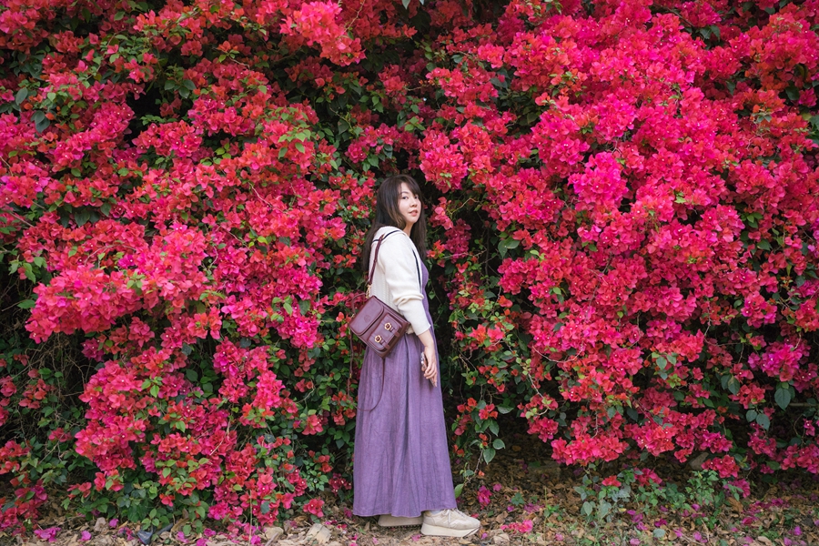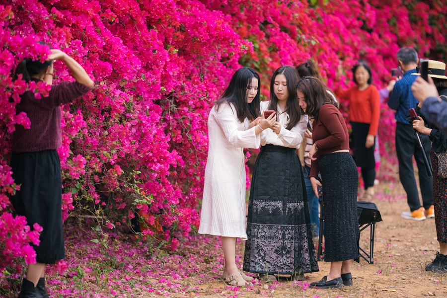 沿著村道,跟著打卡人群步行兩百米左右,便來到了花海的所在地。只見一處魚塘邊,成片的勒杜鵑長勢驚人,枝條與花瓣纏繞如瀑布般綻放,形成了一面四五米高、百米寬的花墻。勒杜鵑是惠州市市花,又名三角梅,向來深受惠州市民的歡迎喜愛。如此美景更引來周邊眾多游客前來賞花打卡,感受鄉(xiāng)村的春日新風(fēng)貌。