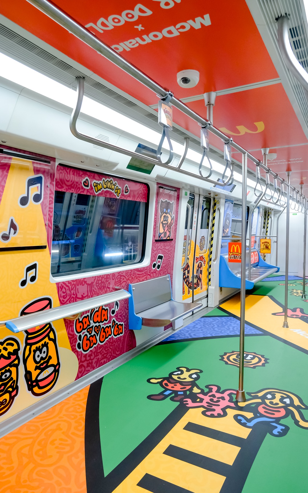 2024年5月22日至2024年6月18日期間,深圳地鐵3號(hào)線的一輛列車被打造為主題列車。車廂內(nèi)從車門到地板、隔檔、拉手、窗戶,隨處可見充滿童趣的聯(lián)名涂鴉元素,歡迎乘坐打卡。
