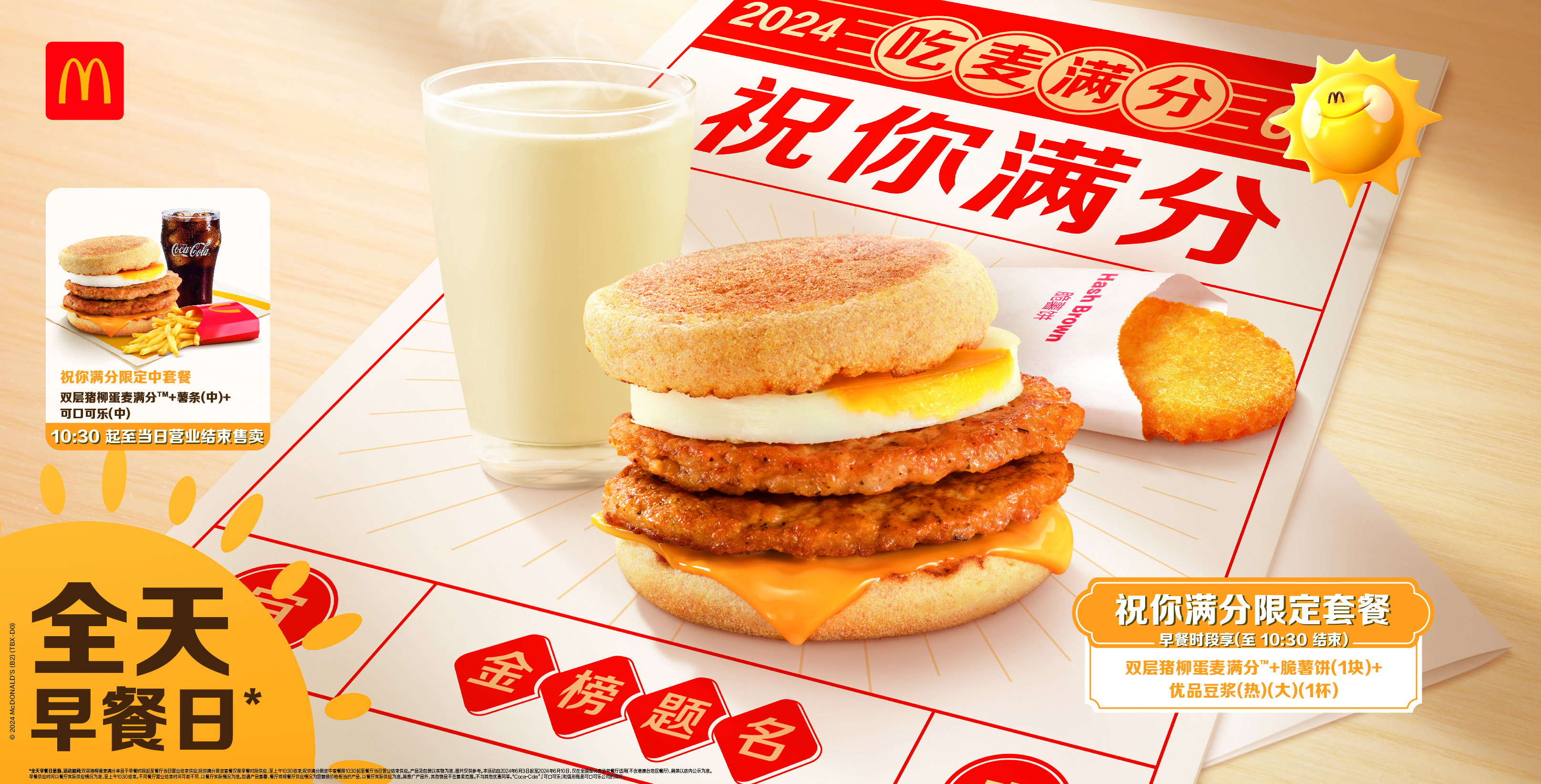 麥當勞中國開啟全天早餐日,雙層豬柳蛋麥滿分全天售賣,為考生送上滿分祝福