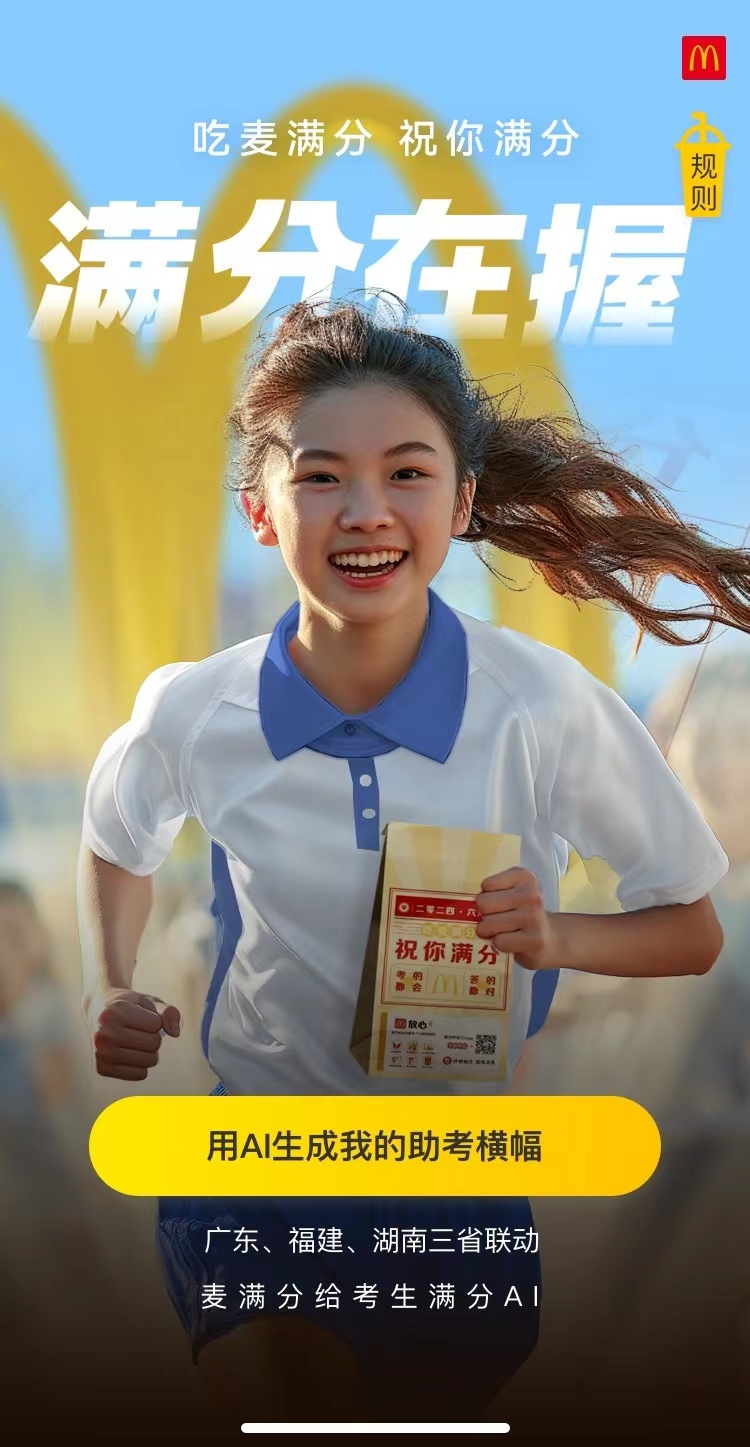 廣東、湖南、福建三省再度聯(lián)動,推出線上AI創(chuàng)意互動——“麥滿分給考生滿分AI”,于高考期間同步上線。6月1日至6月10日,顧客可以通過AI創(chuàng)意互動生成個性化“助考橫幅”,為高考學子送上滿分祝福,還能領取麥當勞準備的多項福利,有機會獲得麥當勞限定周邊、麥當勞美食折扣券等。