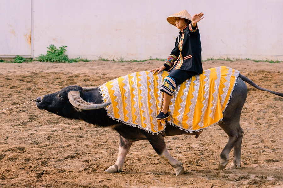 百色苗壯群眾將斗牛作為娛樂(lè)競(jìng)技方式。
