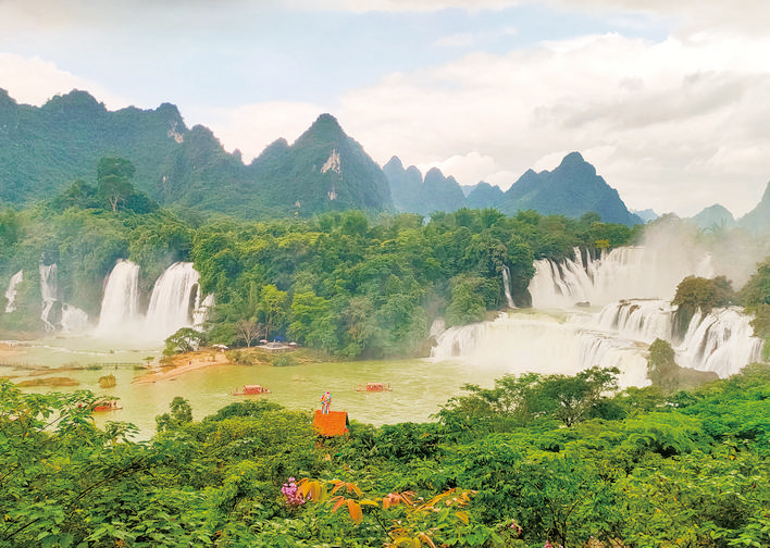 在德天瀑布景區(qū)最高處,俯瞰方圓十幾里的邊境內外景色,歸春河兩岸寧靜美好,邊民安居樂業(yè),好一幅田園風光大作。遠眺連綿起伏的群山,重巒疊嶂,美不勝收。