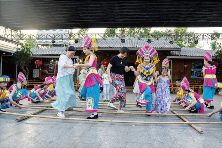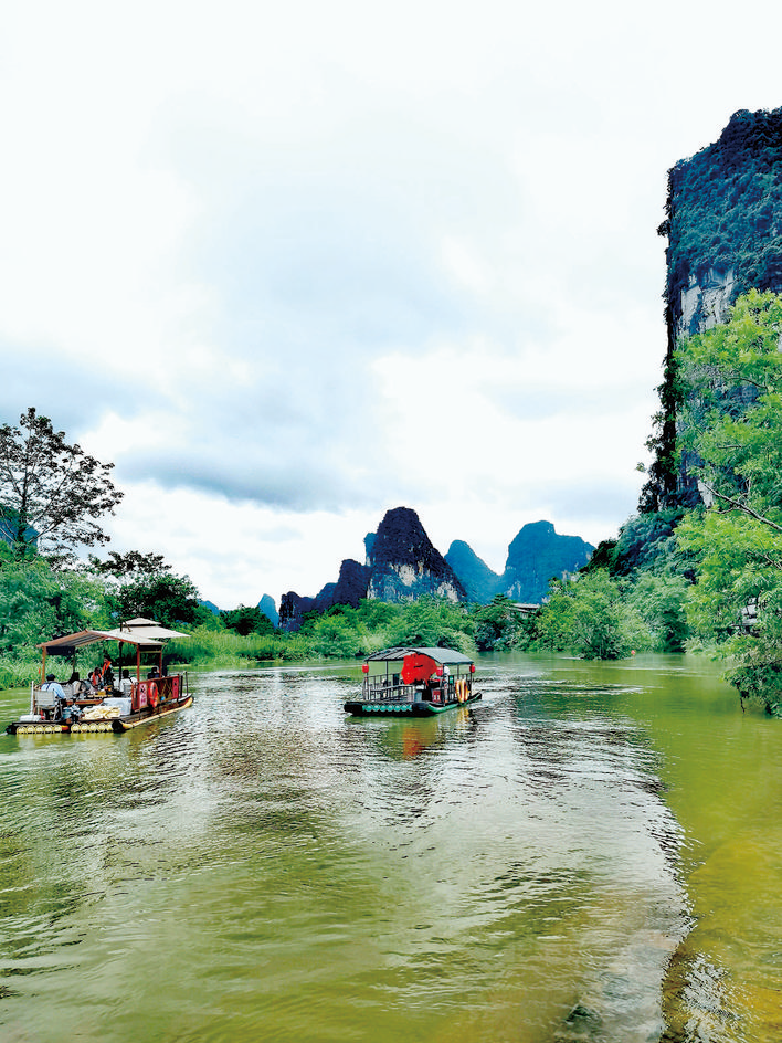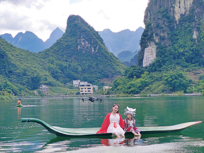 當天黃昏時分進入明仕田園農莊,在竹排上聽壯族阿妹唱山歌,歌聲悠悠揚揚,感受壯鄉(xiāng)山歌獨有的情趣。