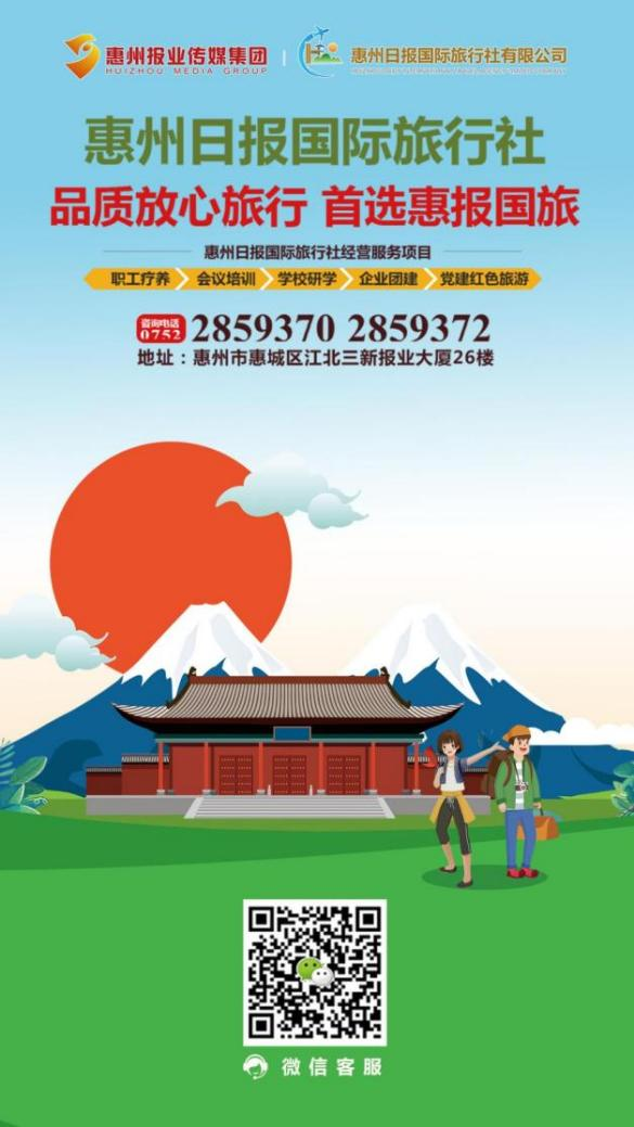 依托惠州報業(yè)傳媒集團(tuán)強(qiáng)大的宣傳平臺和組織策劃能力,全力打造“媒體+旅游”的新平臺,為游客提供始終如一的誠信、優(yōu)質(zhì)、超值的旅游服務(wù)。